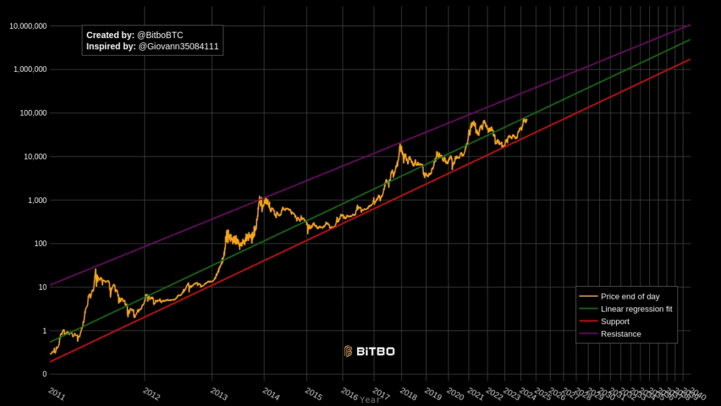 Ako želite da vidite pravu, dugoročnu sliku, morate prestati gledati, morate skloniti obične naočare i pogledati Bitcoin kroz logaritamsku skalu. Dok linearni grafikon stvara iluziju haotičnih i sve većih skokova i padova, logaritamska skala otkriva neverovatnu pravilnost. Bitcoin polako i stabilno raste u savršenom kanalu već skoro dve decenije.
